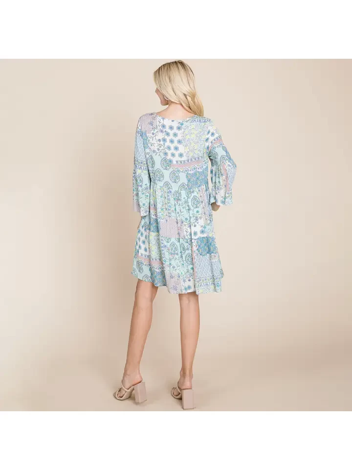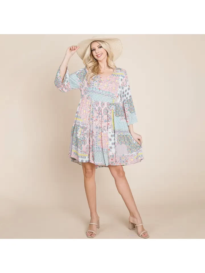 3/4 Sleeve Flowy Pleated Floral Boho Swing Dresses