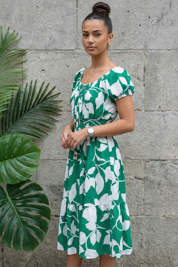 Step into effortless elegance with this Italian-inspired Botanical Print Dress, designed to bring comfort and charm to your seasonal wardrobe. Crafted from lightweight Italian polyester, the fabric is breathable, soft, and comfortable, making it perfect for spring, summer, and early autumn. The wide scoop to soft square neckline features gentle gathers that add a flattering feminine touch. Puff sleeves with elasticated smocking provide subtle volume while ensuring ease of movement throughout the day. A decorative button placket running down the centre enhances the dress with added character and visual interest. The overall abstract botanical print creates a fresh, nature-inspired appeal. Designed in a relaxed, loose fit, the smocked bodice flows into layered tiers that add graceful volume and a beautifully flowy silhouette. Finished with a straight hemline, this dress is ideal for casual wear, evening outings, holidays, and travel, pairing effortlessly with sandals or flats.