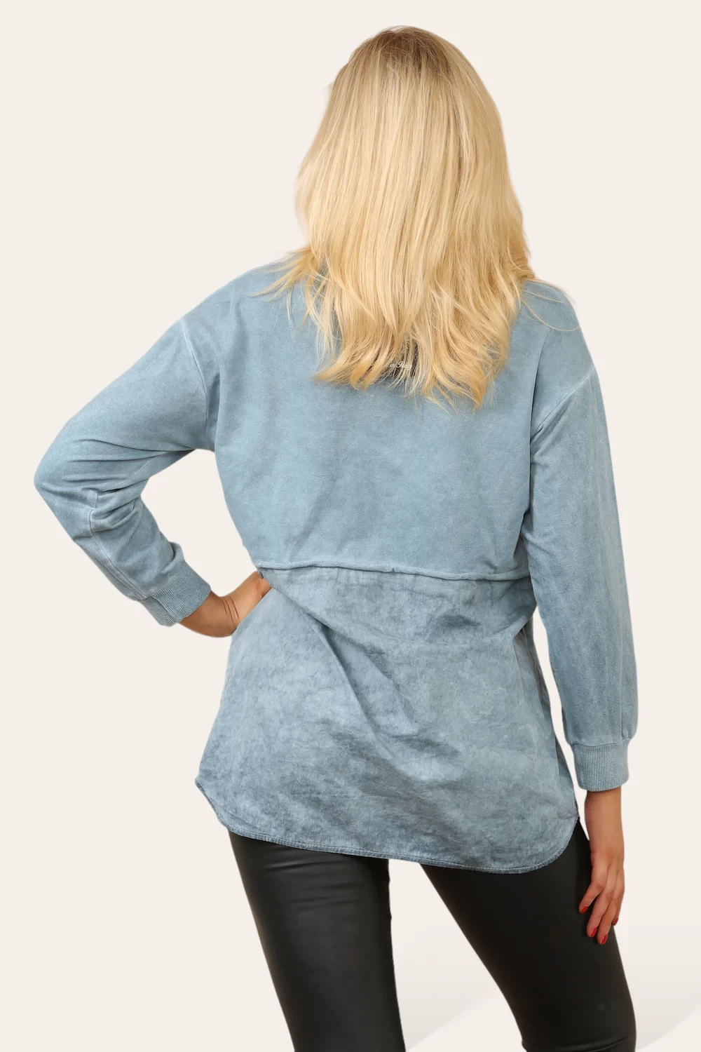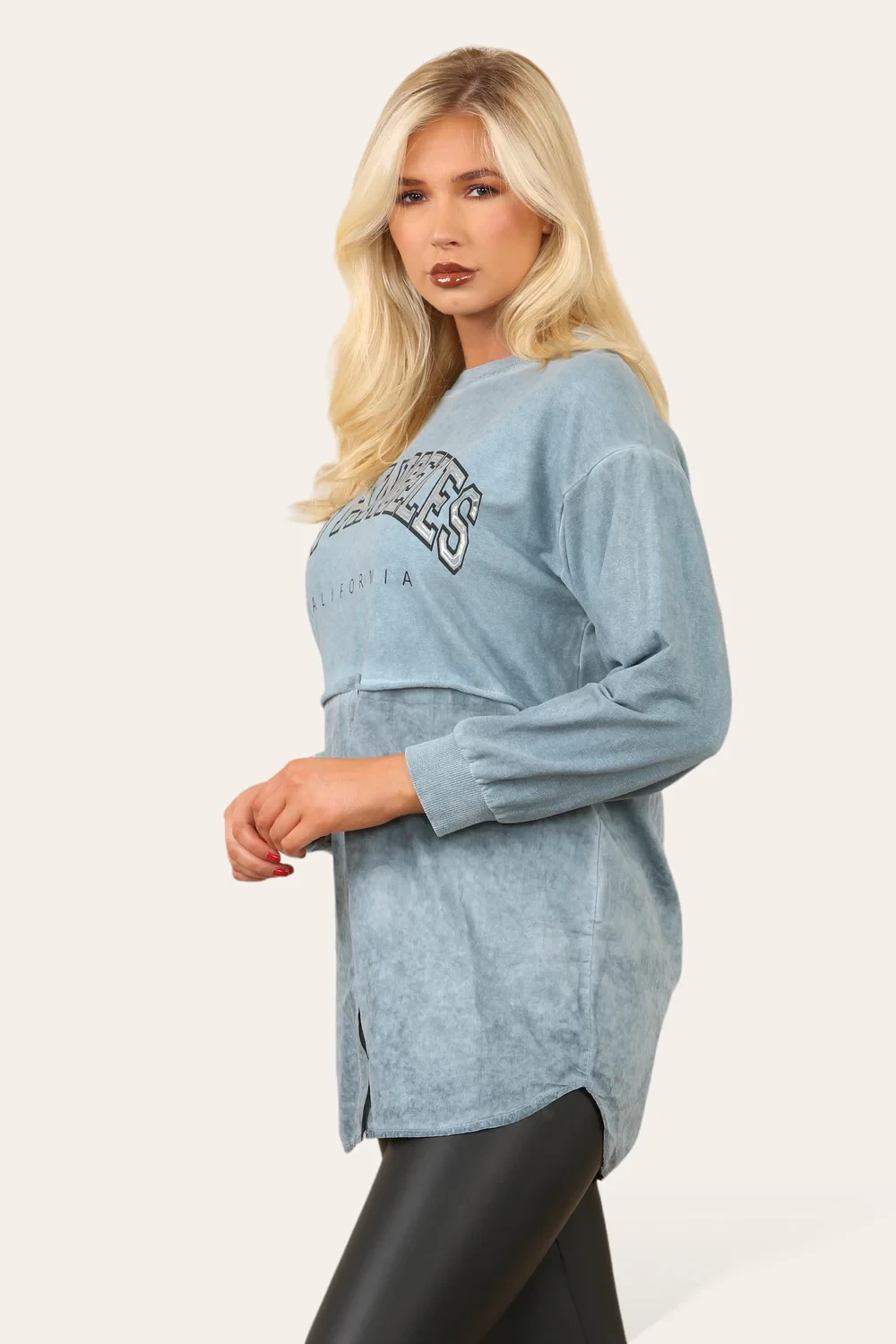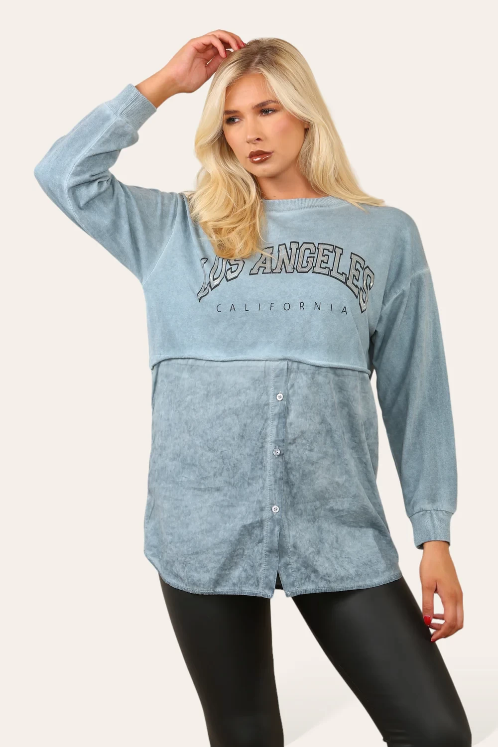 ACID WASH BUTTON DETAIL SLOGAN SHIRT JUMPER