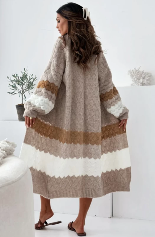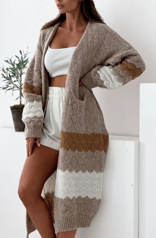 Introducing our must-have Alexis Longline Contrast Knitted Cardigan! Stay stylish this season with our bold Showcasing puffed rhombus style patterns and an open front design. This cardigan also features side pockets for added convenience. The contrasting color block detail on the sleeves and bottom half, adds a playful touch, while the soft and stretchy material ensures a comfortable fit. Available in One Size and comes in approx. sizes of: One Size (UK 8-14 - fits between size 8 up to size 14) and the approx. length measures: 47"(120cm). Crafted with a blend of 100% Acrylic for durability and warmth. Make a statement with our beautiful Italian-made cardigan and don't miss out on this Autumn/winter essential!