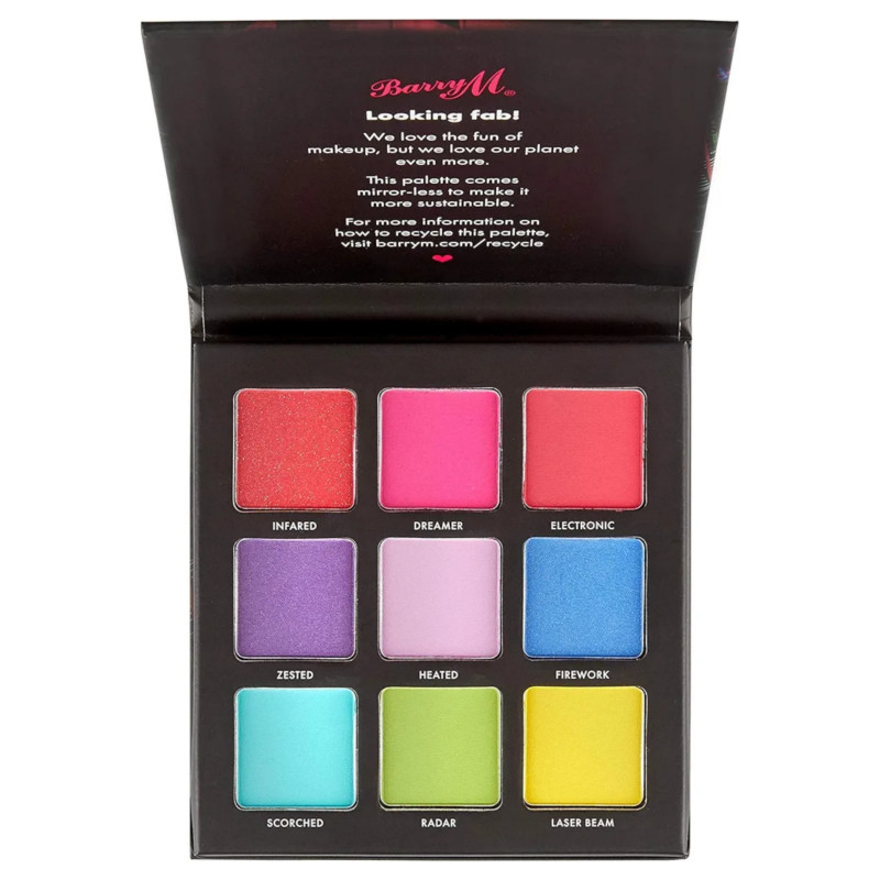 Barry M Eyeshadow Palette - Neon Bright is a bold and vibrant collection designed for those who love experimenting with eye-catching, colorful looks. Featuring a range of intensely vivid shades, this palette includes bright pinks, blues, greens, yellows, and purples that instantly make your eyes stand out. Each shade is crafted with a smooth, creamy texture that glides effortlessly onto the eyelids for easy application and blending. The highly pigmented formula delivers strong color payoff, allowing you to create striking looks with minimal effort. It offers a mix of matte and shimmer finishes, adding depth and dimension to your eye makeup. The blendable consistency ensures seamless transitions between colors without harsh lines. Perfect for creative and artistic makeup styles, it allows you to mix, layer, or wear shades individually for unique looks. The lightweight formula feels comfortable on the skin and resists creasing throughout the day. Suitable for all skin tones, the bright color range enhances your makeup with a fun, energetic vibe. The compact design makes it travel-friendly and convenient for on-the-go use. Whether you want a playful daytime pop or a dramatic festival look, this palette offers endless possibilities. The vegan and cruelty-free formula supports conscious beauty choices. With regular use, it helps you achieve bold, expressive eye makeup effortlessly. Dermatologically tested, it is safe for everyday application. This palette is perfect for creating vivid, statement-making eye looks that truly stand out.