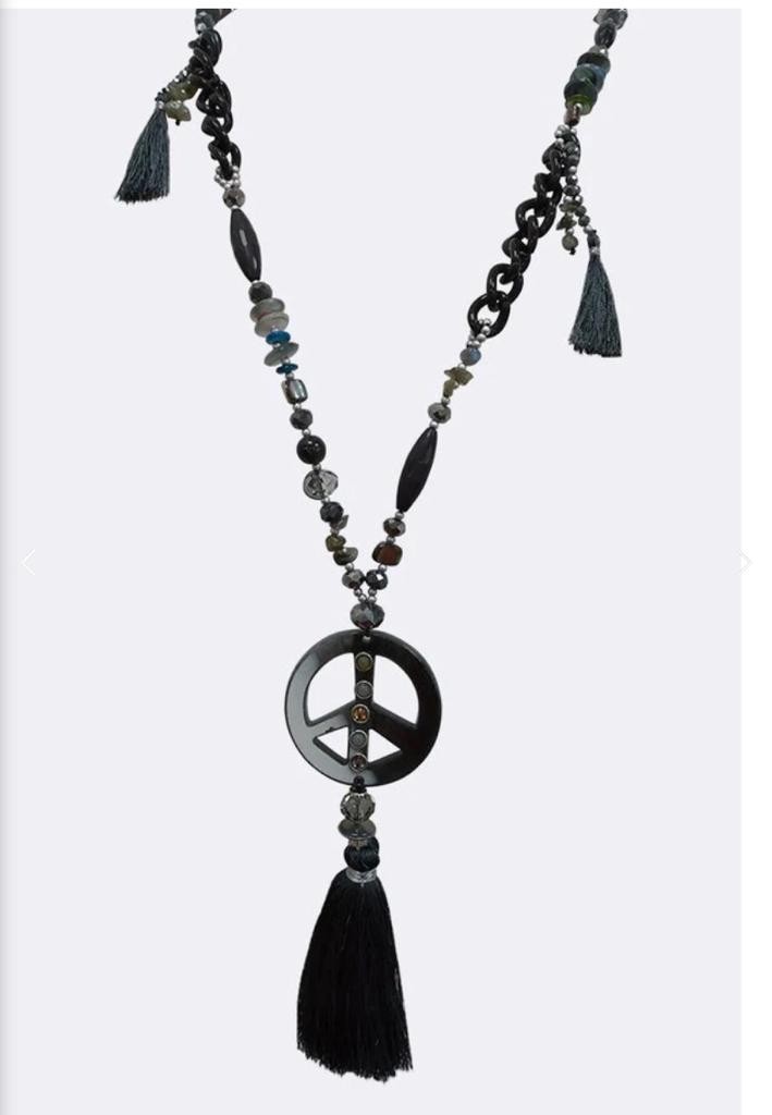 Make a statement with this beaded peace sign & tassel necklace it has fashionable elegance to update any outfit.