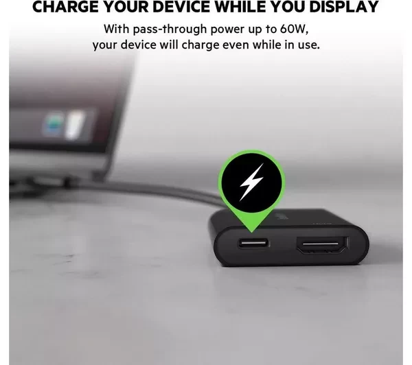 In addition to amazing 4K resolution video transfer, you can power your device at the same time. That's possible thanks to the additional USB Type-C port and 60 W passthrough power delivery.