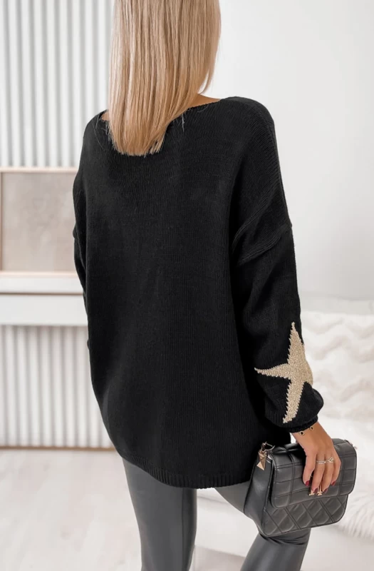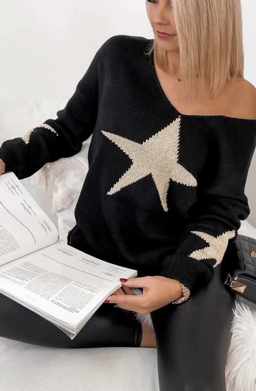 This winter, why not elevate your wardrobe with this stylish, knitted jumper top. Featuring a chic gold shimmer 'STAR' detail on the front and on the arms. Available in long sleeves with a 'V' style cut neckline. Made from a soft and stretchy fabric. Comes in approx. sizes of: One Size (UK 8-14 - fits between size 8 up to size 14) with an approx. length of: 26"(66cm). Made beautifully in Italy with 100% Acrylic. Don't miss out on this must-have piece, for every fashion-forward wardrobe!