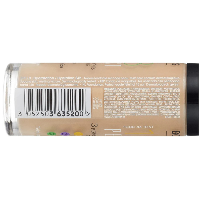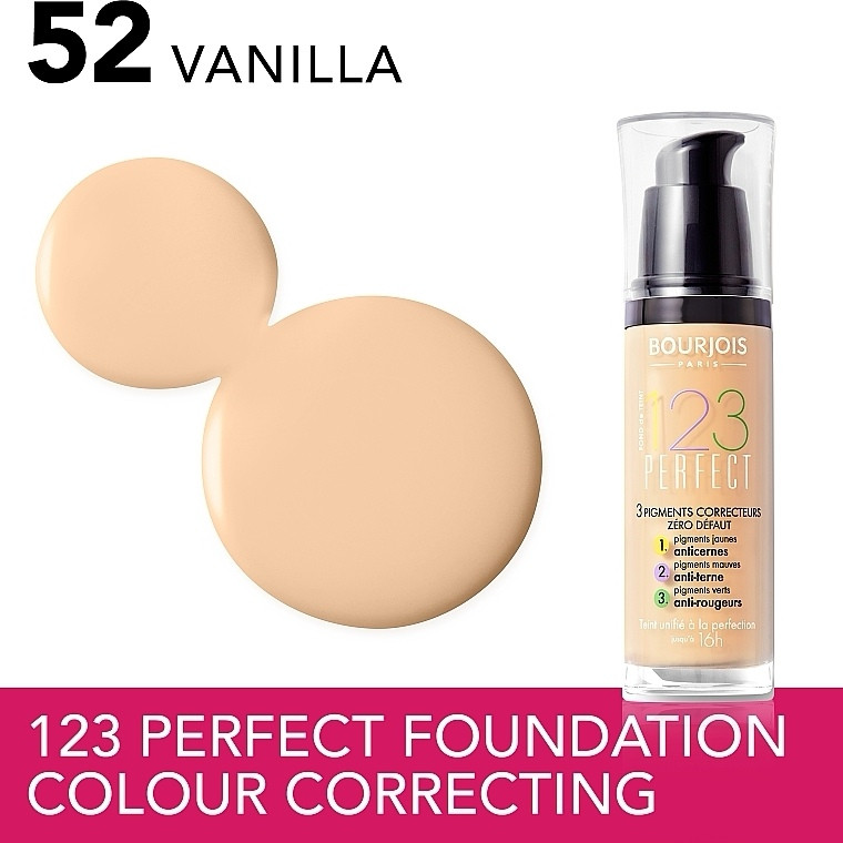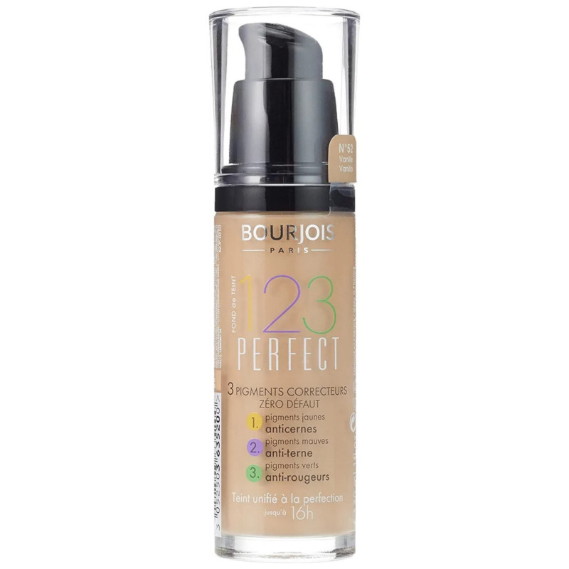 Bourjois 123 Perfect Foundation - 52 Vanilla is a lightweight liquid foundation designed to deliver a flawless, even complexion with a natural and radiant finish suitable for everyday wear. Enriched with three color-correcting pigments, it effectively targets common skin concerns such as redness, dark circles, and dullness for a perfectly balanced look. The yellow pigments help conceal under-eye circles, green pigments neutralize redness, and violet pigments brighten the complexion for a healthy glow. � The shade 52 Vanilla is ideal for light to medium skin tones, providing a soft and natural-looking warmth. Its smooth and fluid texture blends effortlessly into the skin, creating a comfortable “second skin” effect without heaviness. � The foundation offers medium, buildable coverage that can be layered to achieve your desired finish. It provides long-lasting wear of up to 16 hours, helping your makeup stay fresh throughout the day. � The breathable formula allows the skin to feel light and prevents clogged pores, making it suitable for all skin types. � It delivers a soft semi-matte finish that controls shine while maintaining a natural glow. With added SPF 10, it helps protect the skin from harmful UV rays during daily use. � Easy to apply with fingers, brush, or sponge, it ensures smooth and even coverage. It helps blur imperfections and refine the appearance of pores for a polished look. Perfect for both casual and special occasions, it enhances your natural beauty effortlessly. Overall, it is a reliable foundation for achieving smooth, radiant, and long-lasting results.