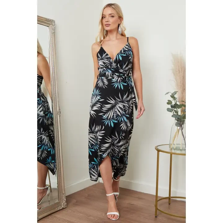 Introducing the Cami Wrap Midi Dress in Black Palm Print, the perfect blend of style and comfort for your next special occasion or warm weather plans. Designed with adjustable straps, this dress ensures a perfect fit for every body type. The light and flowy wrap fit accentuates your waist, while the v-neck plunge neck and wrap detail add a touch of elegance to your look.