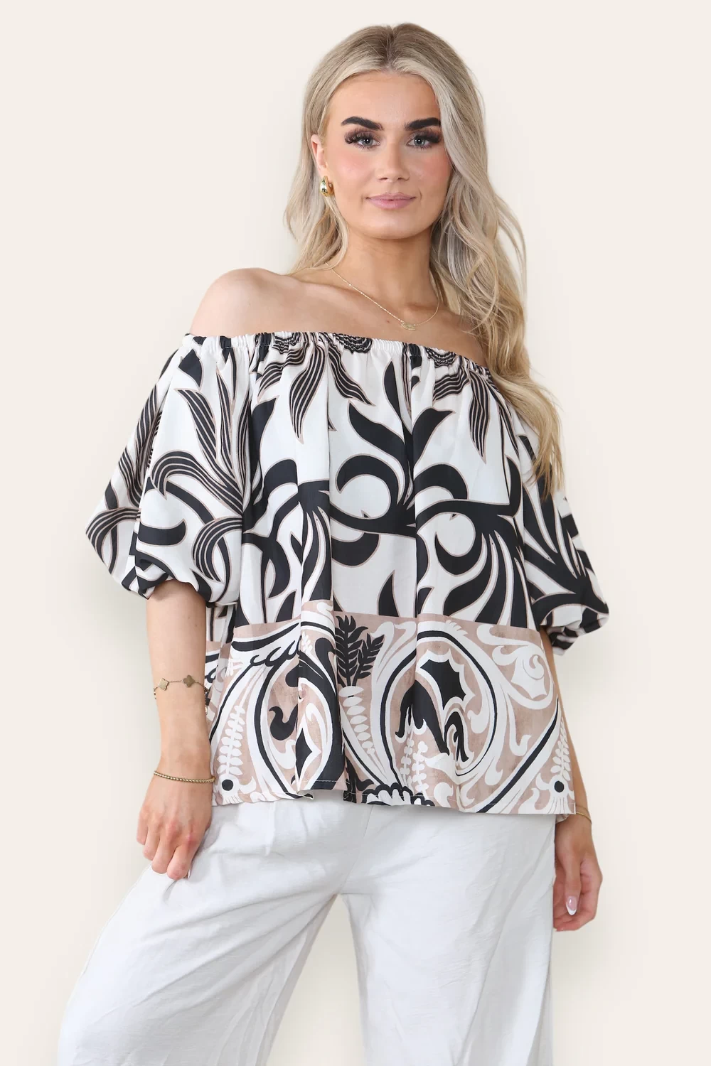 CARA OFF SHOULDER PRINTED TOP - BLACK