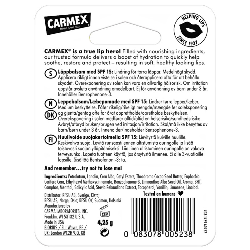 Carmex Long‑Lasting Results Moisturising Lip Balm Classic 4.25 g delivers reliable, deep hydration and soothing care for dry, chapped lips with a time‑tested medicated formula that helps repair and protect delicate skin. Its rich blend of moisturising ingredients like petrolatum and lanolin locks in essential moisture, leaving lips feeling soft, smooth, and comfortably nourished for extended periods. The creamy, non‑greasy texture glides on easily, forming a protective barrier against harsh weather, wind, and environmental stressors that can lead to dryness and cracking. Designed for everyday use, it provides lasting comfort and reduces the need for frequent reapplication. The subtle, classic scent offers a familiar and pleasant experience with each use. Its compact 4.25 g size fits perfectly in purses, pockets, or backpacks, making it ideal for on‑the‑go hydration wherever you are. Suitable for all skin types, including sensitive lips that need gentle yet effective care. Helps prevent flaking and irritation by maintaining moisture balance throughout the day. Great for use under lipstick to enhance smoothness and comfort while extending wear. Dermatologically tested for safety and consistent performance. Leaves lips feeling rejuvenated, healthy, and beautifully conditioned. Provides dependable long‑lasting moisturisation that keeps lips soft through changing seasons. A versatile essential for daily lip care with deep‑conditioning benefits. Carmex Long‑Lasting Results Moisturising Lip Balm Classic keeps lips hydrated, protected, and comforted with every application.