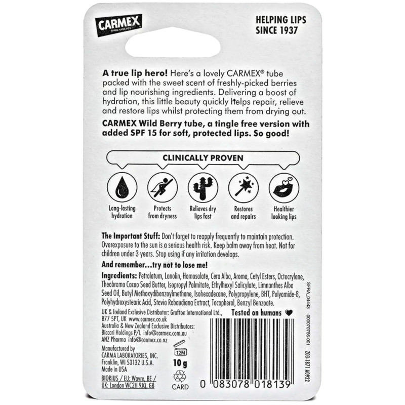 Carmex Wild Berry Moisturising Lip Balm for Healthy Hydrated Lips 10g delivers rich, long‑lasting hydration with a delicious wild berry flavour that keeps lips feeling soft, smooth, and beautifully scented all day. Its nourishing formula helps repair and soothe dry, chapped lips by locking in moisture and forming a protective barrier against environmental stressors like wind and cold. Infused with wild berry extracts, it provides a refreshing fruity aroma that makes each application enjoyable and uplifting. The creamy texture glides on effortlessly, ensuring even coverage and comfort without any sticky residue. Designed for daily care, it helps prevent dryness, flaking, and cracking while supporting natural lip softness. The generous 10g size offers extended use and great value, perfect for home, work, or travel. Suitable for all skin types, including sensitive lips, it delivers gentle yet effective moisturisation. Ideal for use under lipstick to enhance smoothness and comfort throughout the day. Compact and portable, it fits easily in purses, backpacks, or pockets for on‑the‑go touch‑ups. Dermatologically tested to ensure safety and consistent performance. Helps maintain healthy, supple lips even in dry or challenging weather. Its protective barrier guards against moisture loss, keeping lips comfortable between applications. A versatile lip care essential that combines indulgent scent with deep moisturising care. Carmex Wild Berry Moisturising Lip Balm keeps lips hydrated, refreshed, and deliciously fragrant with every use.