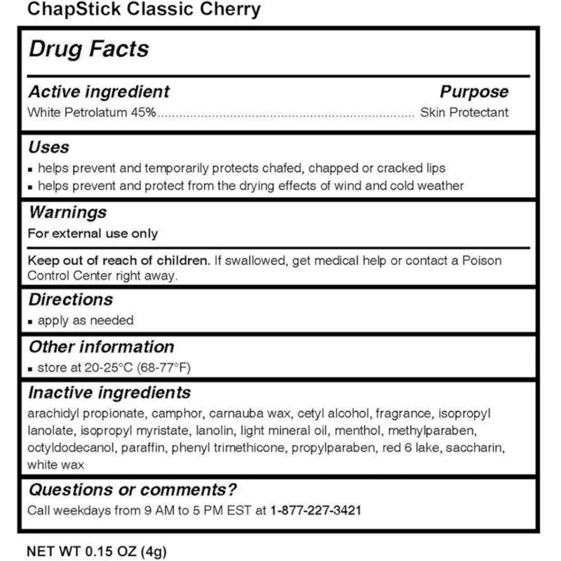 ChapStick Protect and Moisturise Classic Cherry Lip Balm delivers reliable daily care with a delicious cherry flavour that keeps lips soft, smooth, and comforted all day long. Its classic formula helps protect lips from dryness and environmental stressors like wind and cold while locking in much‑needed moisture. Enriched with moisturising agents, it soothes chapped or irritated lips and helps restore natural softness. The smooth texture glides on effortlessly for even coverage and a protective barrier that feels comfortable, not heavy. The sweet cherry scent adds a fun, fruity touch that makes every application enjoyable. Designed for everyday use, it keeps lips hydrated through changing weather and outdoor activities. Compact and portable, the tube fits easily into pockets, purses, or backpacks for on‑the‑go hydration. Suitable for all skin types, including sensitive lips that need gentle, effective care. Helps prevent flaking and cracking while enhancing natural lip health. Can be used under lipstick to boost smoothness and comfort. Long‑lasting moisturisation reduces the need for frequent reapplication. Dermatologically tested to ensure dependable performance and comfort. Leaves lips feeling refreshed, nourished, and beautifully soft. A versatile, essential lip care staple that combines classic protection with delightful cherry flavour. ChapStick Protect and Moisturise Classic Cherry Lip Balm keeps lips hydrated, protected, and deliciously smooth with every use.