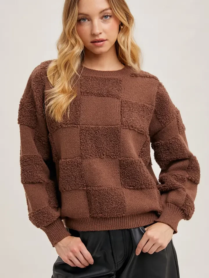The checkered sherpa round neck knit sweater combines cozy warmth with a bold pattern. Featuring a classic round neckline, the sweater is designed with a plush sherpa texture, providing extra softness and comfort. The checkered pattern adds a trendy, playful touch, making it a standout piece for casual, laid-back outfits. Perfect for cooler days, this sweater pairs well with jeans or leggings for a relaxed yet stylish look, ensuring both comfort and flair.