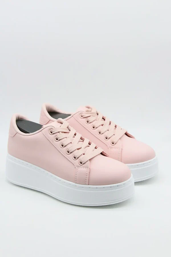 Step into effortless style with these Women’s Blush Pink Platform Trainers, designed to bring both comfort and contemporary fashion to your everyday look. Featuring a smooth soft-touch upper in a delicate blush pink shade, these trainers add a fresh and feminine touch to any outfit. The thick white platform sole not only enhances your height but also provides excellent cushioning and stability for all-day wear. A classic lace-up front ensures a secure and adjustable fit, while the padded collar and soft inner lining offer superior comfort. Whether you’re styling them with jeans, dresses, or casual wear, these trendy sneakers are perfect for shopping trips, casual outings, travel, or relaxed weekends.