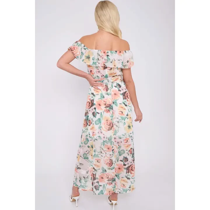 The Cream Rose Floral Print Chiffon Bardot Maxi Dress is a stunning and elegant piece featuring a delicate rose floral print on lightweight chiffon fabric. Designed with an off-the-shoulder Bardot neckline and a flowing maxi length, this dress exudes timeless charm and sophistication. Perfect for a variety of occasions, it is ideal for garden parties, weddings, or romantic outings. Pair it with sandals for a relaxed look or dress it up with heels for a more refined ensemble.