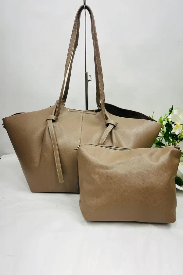Stay stylish and organized with this elegant faux leather tote handbag, designed for the modern woman. Featuring a sleek and structured silhouette in a neutral beige tone, this bag effortlessly complements any outfit, from office wear to weekend casuals. Crafted with premium quality faux leather, it boasts a smooth finish and durable build. The adjustable and removable crossbody strap adds versatility, allowing you to wear it as a shoulder bag or carry it as a tote. Its roomy interior provides ample space for daily essentials including a tablet, makeup pouch, wallet, and more. The minimalist design is enhanced with long double handles and subtle knotted detailing, making it a timeless addition to your collection.