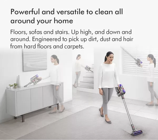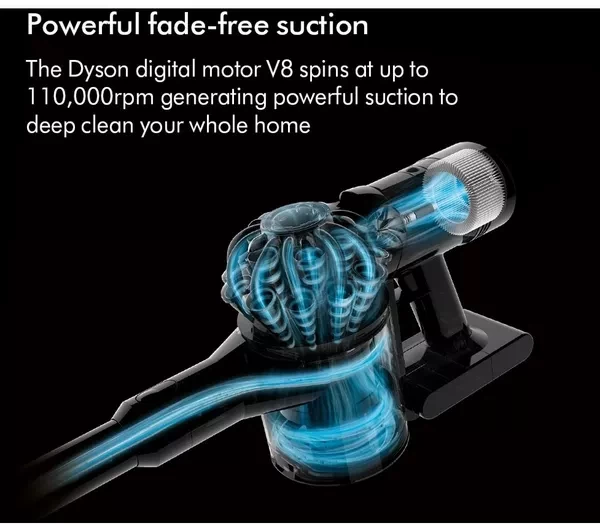 This cordless Dyson V8 gives you up to 40 minutes of fade-free suction - zip from room to room without any annoying cables getting in your way. Ground in dirt can be stubborn, but it's no match for the powerful Dyson digital motor. It's been designed to run nice and quietly without compromising on performance. The Detangling Motorbar lifts long hair and pet hair from your floors, and it's specially-designed vanes mean you won't need to unclog it as you're cleaning. It's a life saver if you have furry friends in the house.