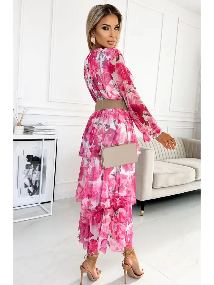 Be the star of any summer party in this stunning floral chiffon tiered maxi dress! Available in a variety of colors and patterns. This dress features a front low cut 'V' wrap neckline and an elasticated waistband for a comfortable and flattering fit. The long see through sleeves with elasticated frill cuffs adds a touch of elegance, while the tiered frill style with the added fabric belt fastening detail, creates a beautiful silhouette. With its soft and stretchy fabric and added lining underneath, this dress is both stylish and comfortable. Available in approx. sizes of: S (UK 8) M (UK 10) L (UK 12) and XL (UK 14) with an approx. length of: 52"(132cm). Made in Italy from 100% Polyester and 95% Viscose, 5% Elastane. This dress is sure to make a statement and is a must-have for any fashion-forward wardrobe.
