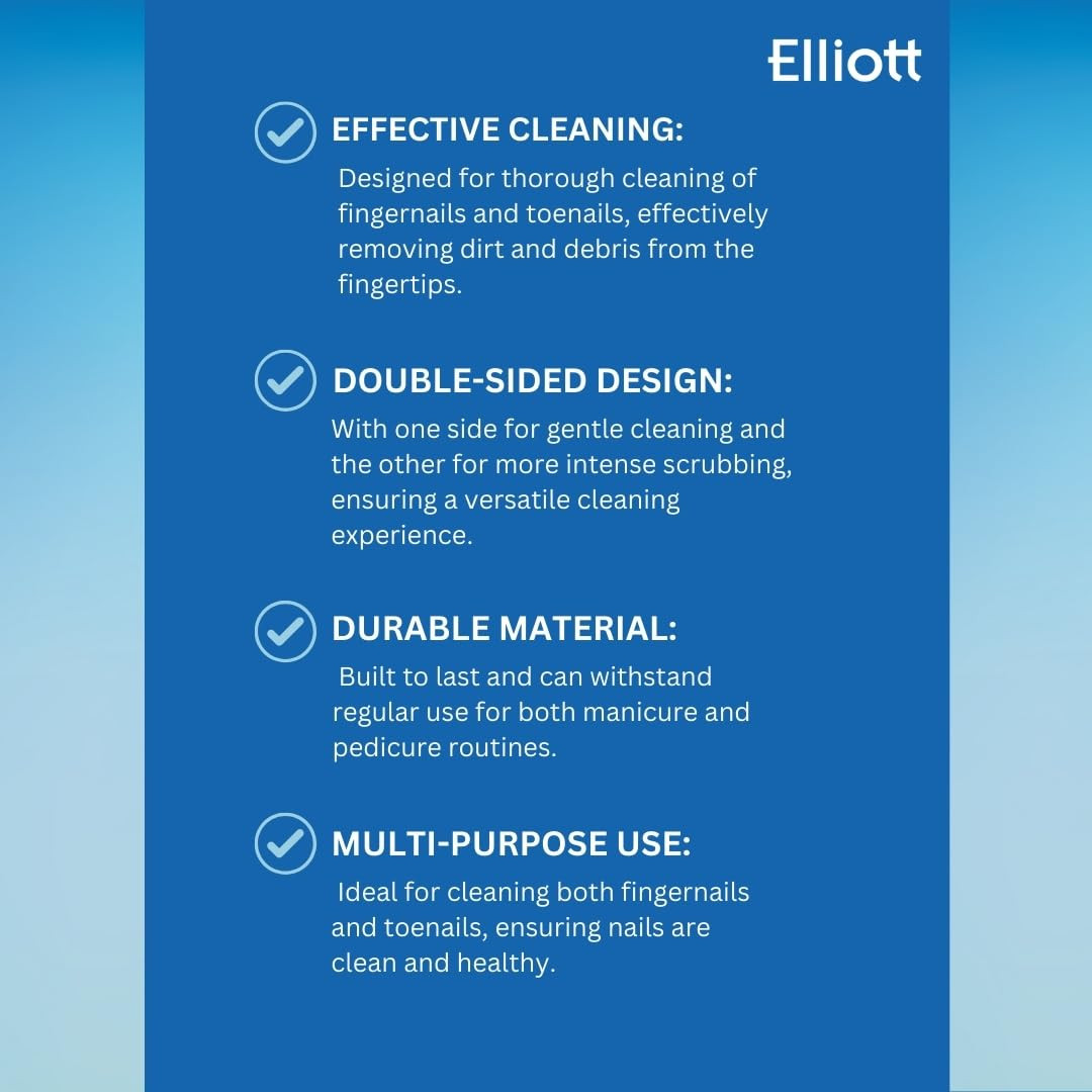 Elliott Wooden Double Sided Nail Brush for Gentle Cleansing is a practical and durable nail care tool designed to keep nails and cuticles clean and healthy. Crafted with a sturdy wooden handle, this brush provides a comfortable grip for precise control during use. It features two sides with different bristle textures: one with soft bristles for gentle cleansing and polishing, and the other with firmer bristles to remove dirt and debris from under the nails. The double-sided design makes it versatile for everyday nail care, ensuring thorough cleaning without damaging the nails or surrounding skin. Ideal for natural and artificial nails, it helps maintain hygiene and promotes stronger, healthier nails. The natural bristles are gentle on the skin yet effective at exfoliating the cuticle area. Compact and lightweight, it is perfect for use at home, in salons, or while traveling. Its eco-friendly wooden handle is sustainable and long-lasting, providing a practical alternative to plastic brushes. Regular use of the brush prevents dirt build-up, strengthens nails, and supports a polished, manicured appearance. Suitable for both hands and feet, it can be used before applying nail treatments, polish, or hand care routines. The gentle bristle side also helps stimulate circulation around the nail bed for healthier growth. Easy to clean and maintain, it ensures hygiene and durability over time. Elliott Wooden Double Sided Nail Brush combines functionality, comfort, and eco-conscious design for effective, gentle nail cleansing every day. ✨