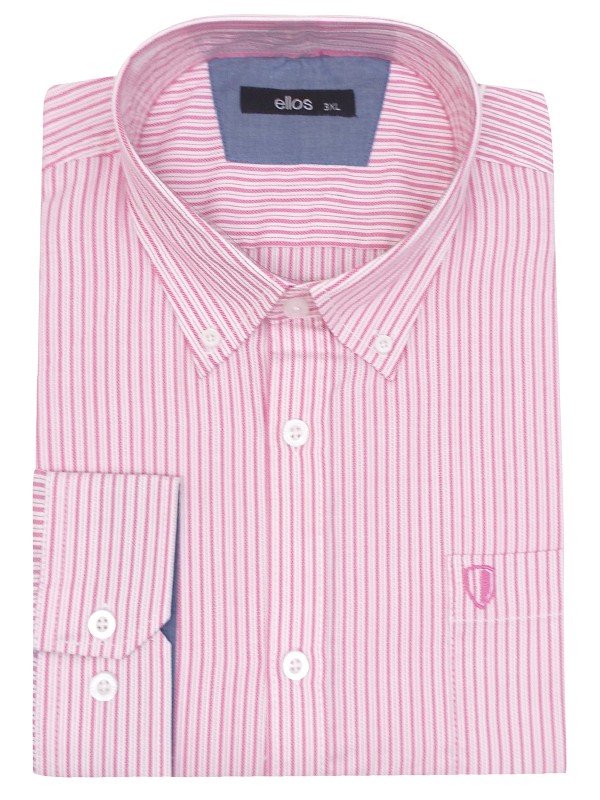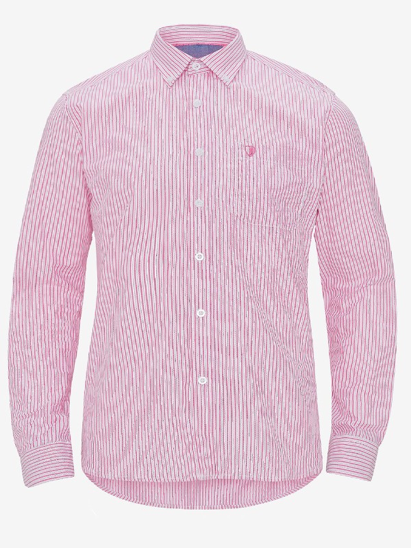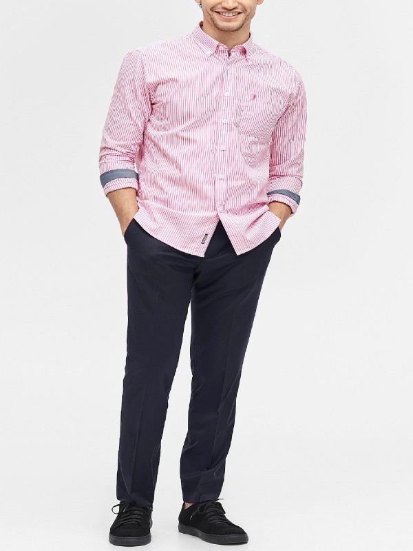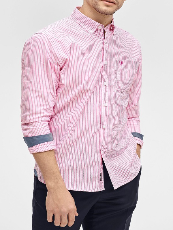 Striped cotton shirt with button-down collar. A sewn-on chest pocket with small embroidery and a cuff with two buttons. Slightly longer back piece with rounded bottom edge. Length from the back is approx 80cm in a size M.