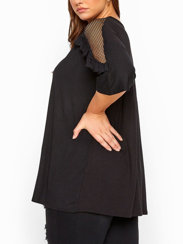 Add a touch of edge to your look with this top. With an on-trend fishnet insert, it finishes with 3/4 length sleeves, ruffle detail and a simple scoop neckline.
