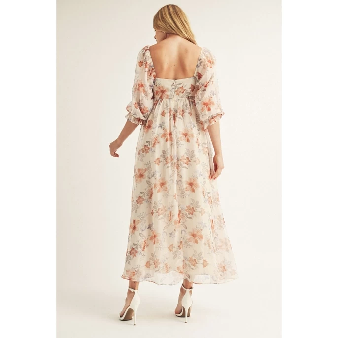 Maxi baby doll dress with a floral print. It has a sheer but lined fabric, a square neckline, 3/4 puffy sleeves, bust darts, an empire waist, a gathered waistline, a flowy bottom, and an invisible zipper back.