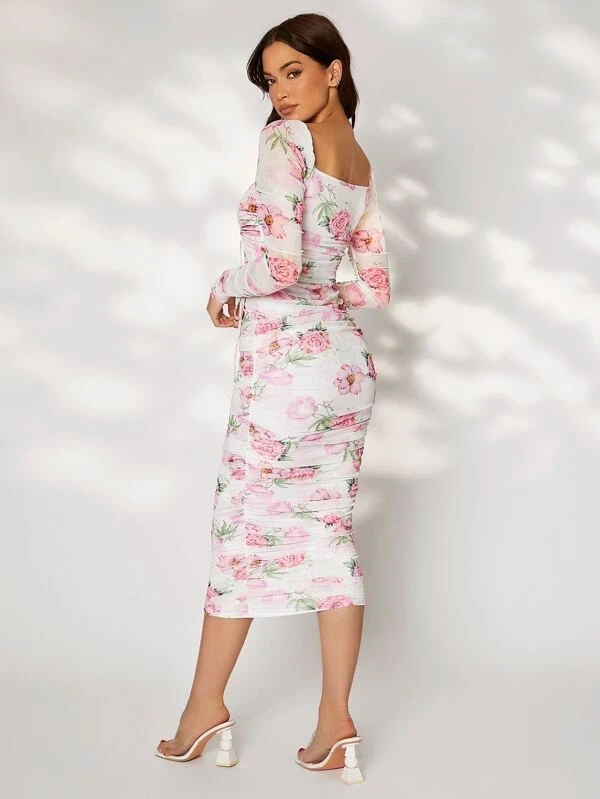 Floral Print Drawstring Ruched Bodycon Dress