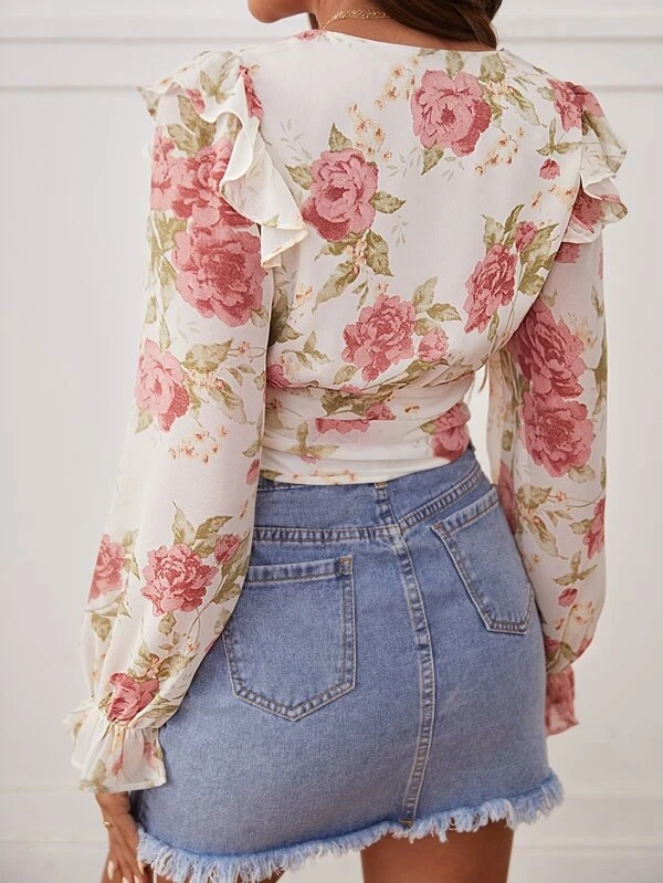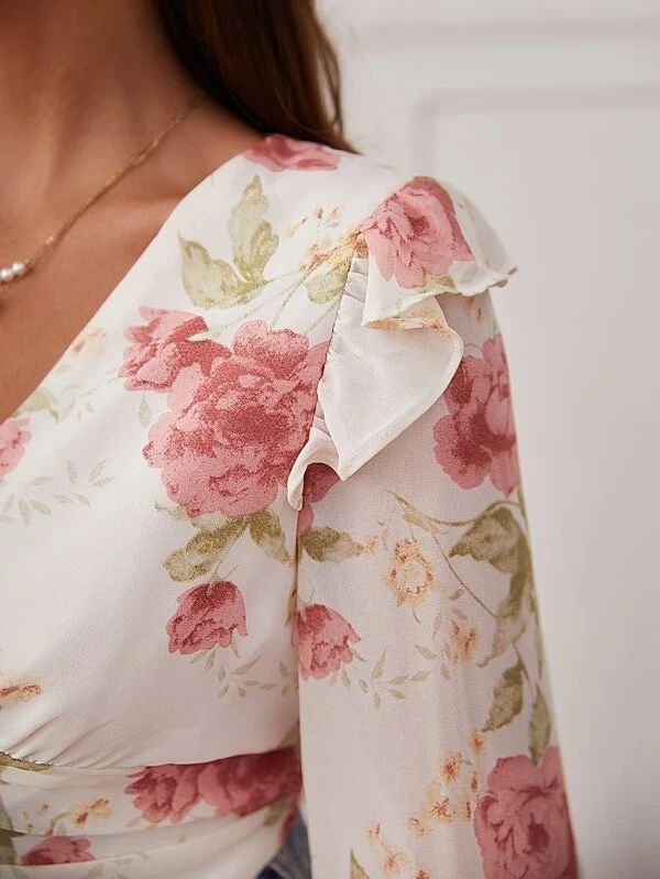Floral Print Flounce Sleeve Ruched Ruffle Trim Blouse