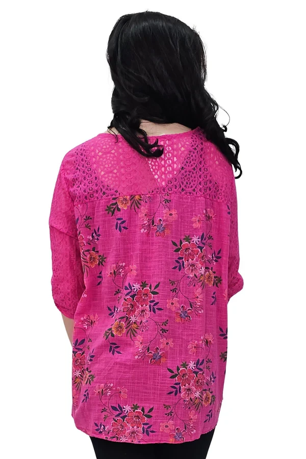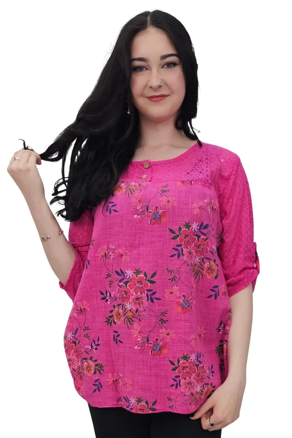 Add a touch of romance to your everyday wardrobe with this Italian cotton tunic, designed for plus-size women who adore a soft, feminine look. Featuring an elegant floral print, this top combines casual comfort with delicate beauty. The round neckline and short sleeves offer a relaxed silhouette, while intricate lace detailing graces the upper chest and shoulders, adding charm and vintage-inspired elegance. Made from breathable, lightweight cotton, it’s perfect for spring and summer days when comfort and style are key. The loose fit flatters all body types and allows for easy movement, whether you're out shopping, enjoying lunch with friends, or exploring the outdoors. The floral print and lace blend effortlessly to create a timeless boho-chic aesthetic that pairs well with jeans, leggings, or linen trousers. This Italian-crafted top is a beautiful fusion of comfort, artistry, and effortless grace.