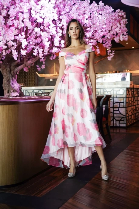 A graceful fusion of enchanting beauty and timeless style. Embrace the spirit of romance and femininity with this captivating gown. Delicate floral patterns adorn the airy mesh fabric, creating a whimsical and enchanting look. The gentle blooms add a touch of natural beauty, making this dress perfect for spring and summer occasions. This dress boasts a sweeping midi length that exudes grace and sophistication. The flowing skirt adds an ethereal quality to your appearance, making you feel like you're walking on air. The off-the-shoulder neckline reveals a hint of skin, offering a sweet and alluring frame for your shoulders and décolletage. It's a timeless style that adds a touch of romanticism to any event.