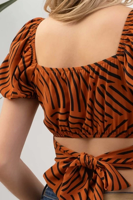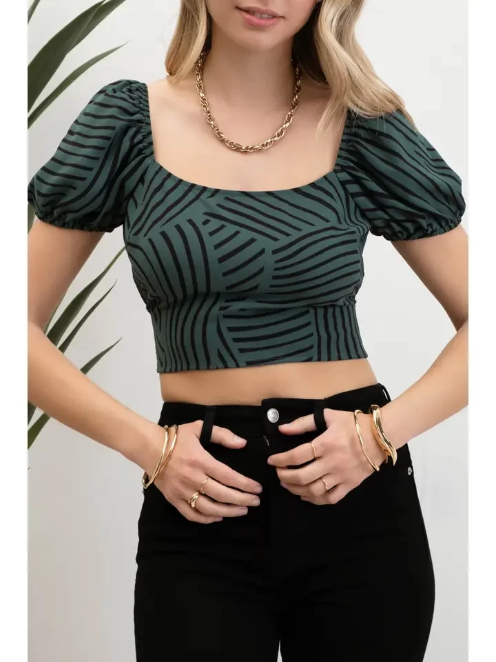 SCOOP NECKLINE SHORT PUFF SLEEVES ELASTIC SLEEVE CUFF ELASTIC BACK BACK SELF TIE CROP TOP GEOMETRIC PRINT NOT LINED 100% POLYESTER