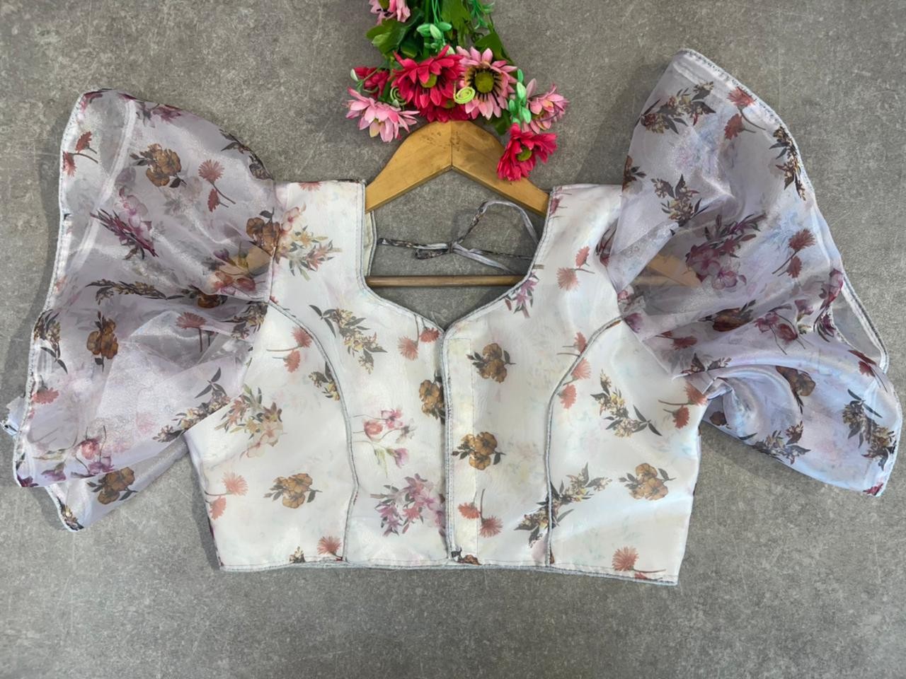Fabric : pure Khadi Organza long boutique style frill with heavy rich digital printed Blouse size:- 38( margin up to 42)
