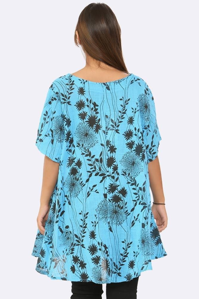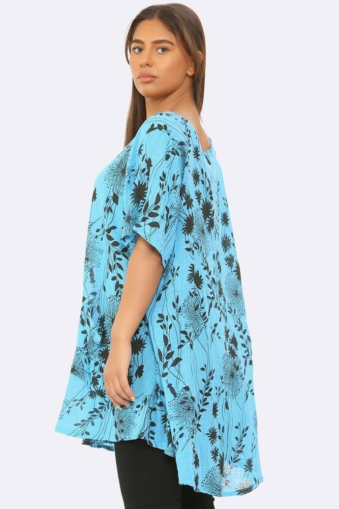 This leaf print top is a summery option for a weekday or weekend. Made in Italy this front pocket mixed linen and cotton top has a classic round neckline- quarter sleeves for a modest versatile look and a designer leaf print finish. Baggy and plus size to satisfy many body types. Dress it in boots for a long walk.