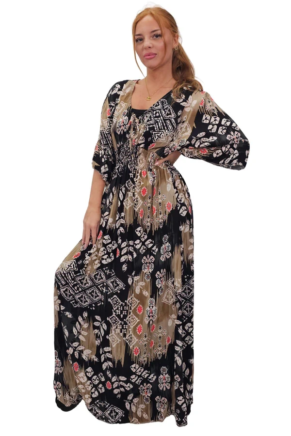 Step into effortless elegance with this Italian oversized dress, featuring a charming leaves print that exudes nature-inspired beauty. Crafted from soft and breathable viscose, this plus-size loose-fit dress is perfect for spring and summer, keeping you cool and comfortable all day. The V-neckline flatters the neckline, while the gathered waist with a drawstring allows for an adjustable fit, enhancing your silhouette while maintaining a relaxed feel. The standout feature of this dress is its short flared sleeves, adding a graceful and feminine touch. Its oversized cut drapes beautifully, making it an easy-to-wear piece for casual outings, vacations, or weekend getaways. Whether paired with sandals for a relaxed daytime look or dressed up with accessories for an evening affair, this dress is a versatile must-have that blends comfort with effortless style.