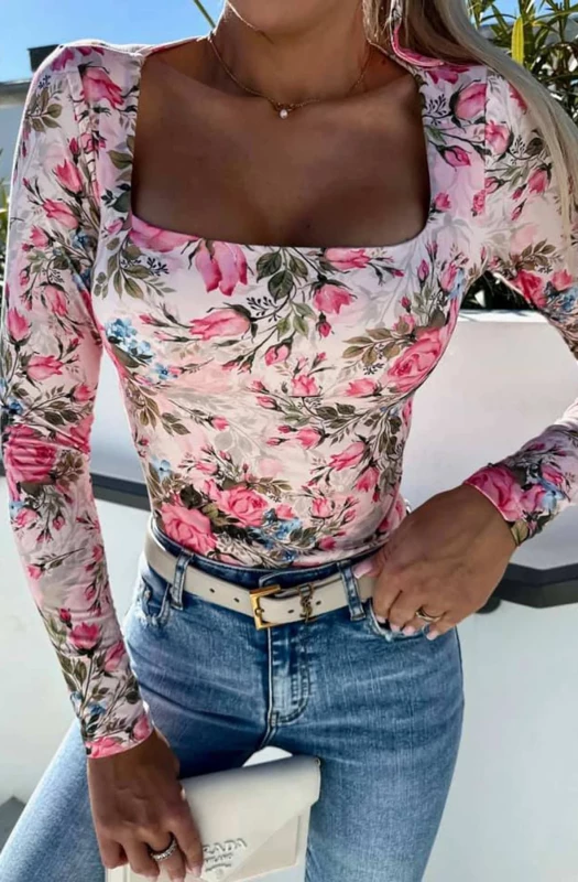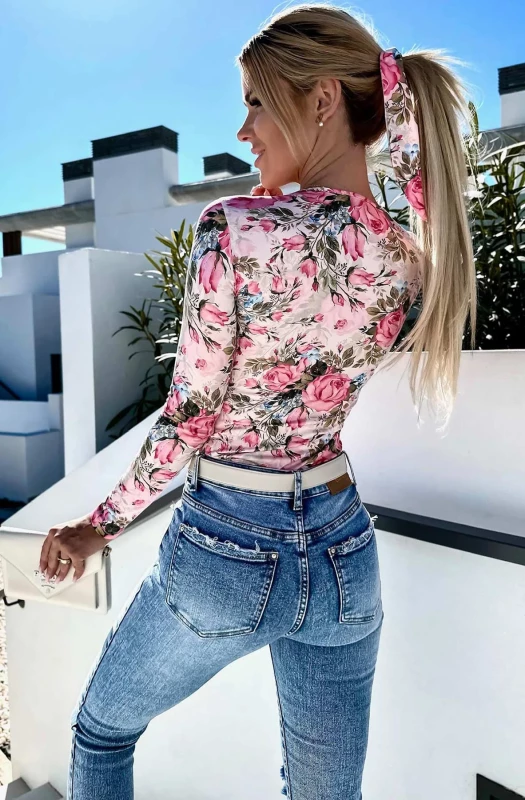 All over summer florals with long sleevesHook/eye fastening detail (bottom half)Soft and stretchy with short lining underneath (top half)