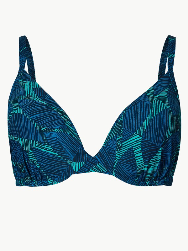 Take the plunge this summer with this stunning plunge bikini top. Featuring a playful leaf print, this patterned bikini is padded to give you a smooth finish and modest coverage after every dip in the pool. With adjustable straps helping you find a comfy fit and underwiring providing fabulous support.