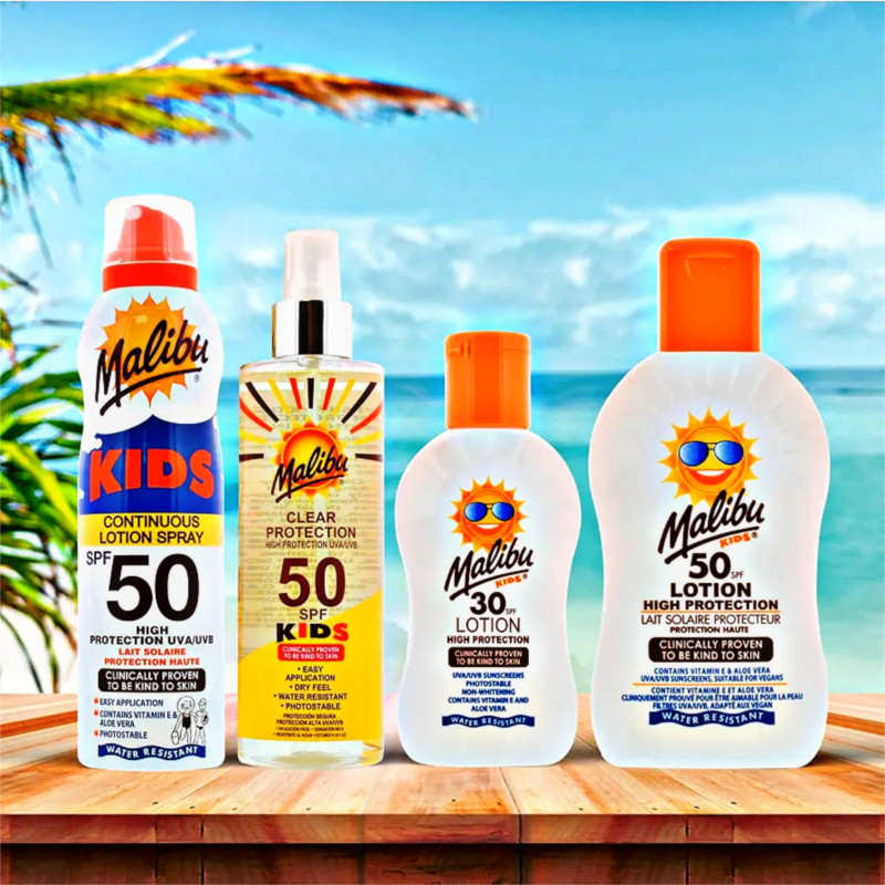 Malibu Kids SPF 30 Sun Lotion offers high, reliable protection specially designed for children’s delicate and sensitive skin. Its gentle, dermatologically tested formula shields young skin from harmful UVA and UVB rays, helping prevent sunburn and long-term skin damage. The lightweight, non-greasy texture absorbs quickly, making it comfortable for active kids who love playing outdoors. Enriched with moisturising ingredients, it keeps the skin soft and hydrated while providing strong sun defence. The water-resistant formula ensures longer-lasting protection during swimming, sports, and beach activities. Easy to apply and spread evenly, it helps parents ensure complete coverage without fuss. Suitable for daily use in all seasons, especially under strong sunlight. The lotion’s mild formulation is kind on sensitive skin, reducing irritation risks. Its long-lasting performance offers peace of mind during extended outdoor play. Reapplying is simple, helping maintain consistent protection throughout the day. The 200ml size is practical for family outings, travel, and school bags. Ideal for holidays, parks, beaches, and everyday sun exposure. With Malibu Kids SPF 30, children enjoy safe, happy outdoor time with trusted protection. This lotion offers a perfect balance of gentle care and strong defence for growing skin.