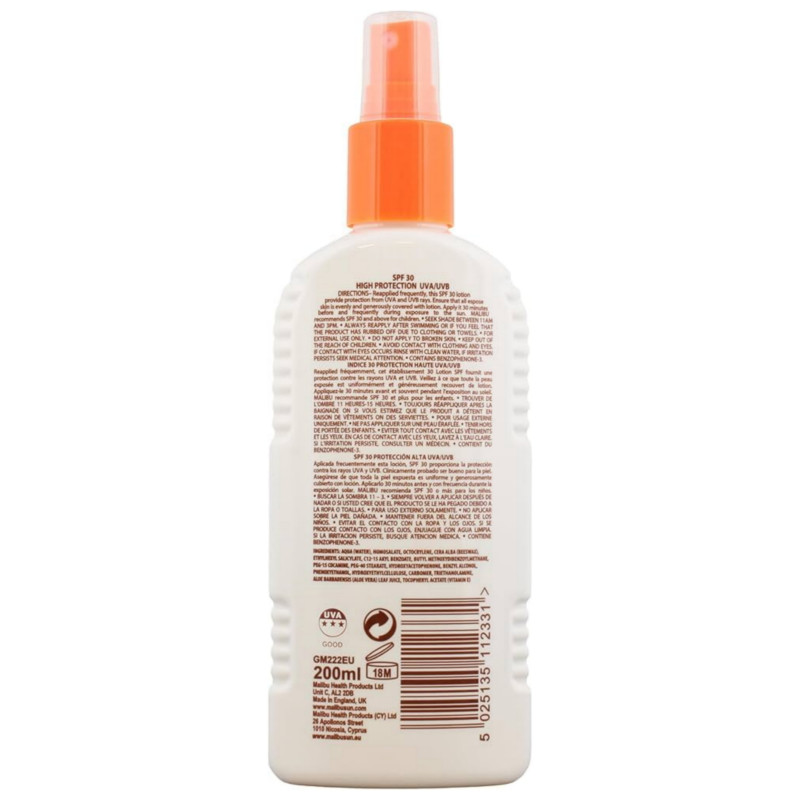 The Malibu Sun Lotion Spray 30 SPF UVA/UVB High Protection 200ml provides a high level of protection against both harmful UVA and UVB rays, helping to prevent sunburn and long-term sun-induced skin damage. The formula is clinically proven to be gentle on the skin, suitable for all skin types, and is also water-resistant, making it ideal for use during swimming or sweating. Enriched with beneficial vitamins, specifically Vitamin E and Pro Vitamin B5 (Panthenol), along with soothing Aloe Vera extract, the lotion helps to nourish, hydrate, and restore the skin's natural moisture levels, leaving it feeling soft and healthy. Its non-greasy formula absorbs quickly into the skin without leaving a sticky or white residue, which users often praise in reviews. The convenient spray application method allows for quick, hassle-free coverage, even on hard-to-reach areas, ensuring all exposed skin is evenly and generously covered. Proudly made in England, this sun lotion is vegan-friendly and is only ever tested on humans. For optimal efficacy, it should be applied liberally approximately 30 minutes before sun exposure and reapplied frequently, especially after toweling, swimming, or sweating.