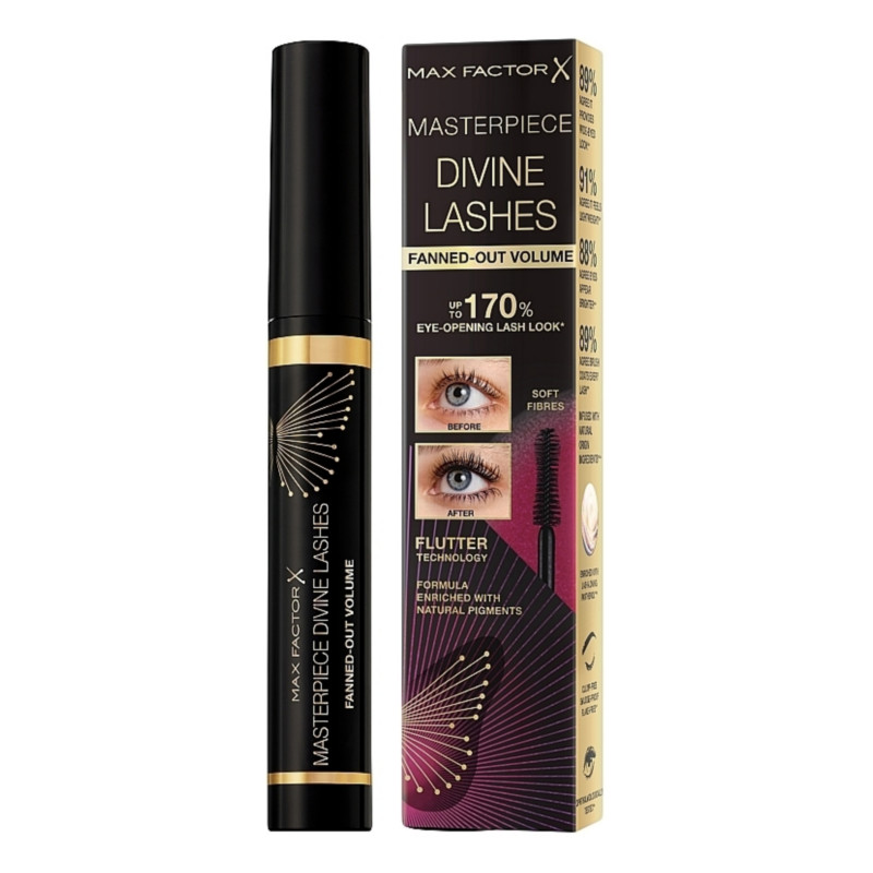 Max Factor Divine Lashes Fanned Out Volume Mascara in Rich Black creates elegantly lifted, fuller lashes with a soft, feathered finish. The intensely pigmented Rich Black shade enhances lash definition for a bold yet refined look that suits any occasion.