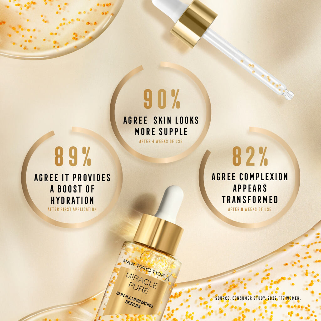 The Max Factor Miracle Pure Serum 30ml is a multi-purpose skincare product designed to enhance your natural glow while delivering nourishing benefits for healthier-looking skin. Formulated with powerful ingredients like Vitamin C and Niacinamide (Vitamin B3), this serum helps brighten the complexion, even out skin tone, and improve overall skin texture over time. It features unique golden illuminating pearls that instantly reflect light, giving the skin a radiant, healthy-looking glow from the first application. The lightweight and silky texture absorbs quickly into the skin without leaving a greasy residue, making it comfortable for daily use. This clinically proven formula is made with around 95% natural origin ingredients, offering a gentle yet effective skincare solution suitable for most skin types. It works to hydrate and firm the skin, helping reduce the appearance of fine lines and dullness with continued use. The serum can be used alone for a natural glow, applied under makeup as a radiant base, or even mixed with foundation to enhance luminosity and skincare benefits. Its antioxidant-rich composition supports skin health while protecting against environmental stressors. Over time, it helps refine pores, smooth skin texture, and promote a more even, youthful complexion. The vegan-friendly formulation aligns with modern beauty preferences while maintaining high performance and visible results. Designed for versatility, it easily fits into both simple and advanced skincare routines. With consistent use, the skin appears brighter, smoother, and more revitalized, making it an essential addition to any beauty regimen. Overall, this serum delivers a perfect balance of skincare and radiance, helping you achieve glowing, healthy-looking skin effortlessly.