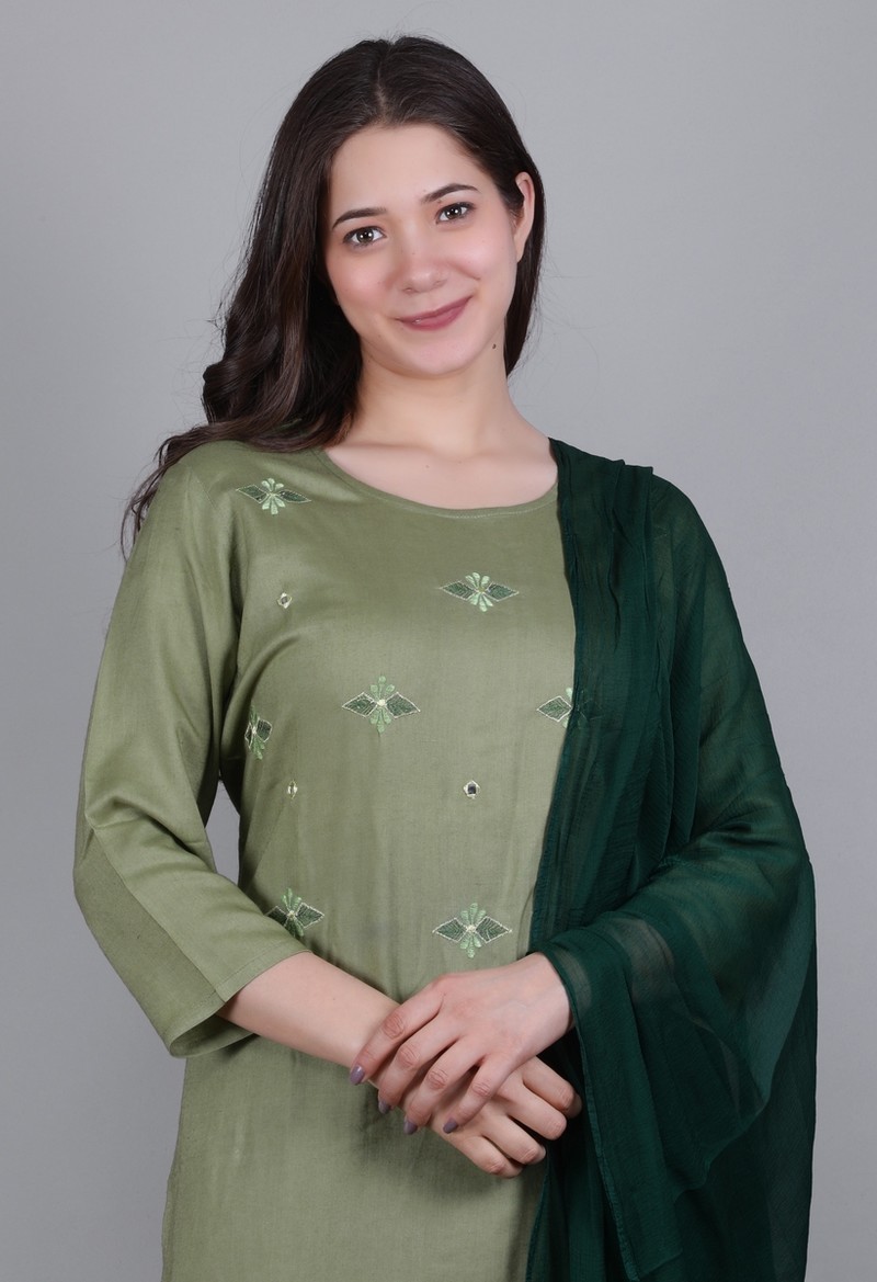 Rayon Embroidered Kurti With Plazzo Pant & Dupatta Set. Round Neck. 3/4 Sleeve. Paired With Contrast Plazzo Pant. All Round Elastic. Chiffon Dupatta., Interlocking-Same Thread, Color Will Not Bleed, Will Not Shrink, Handwash,Separately
