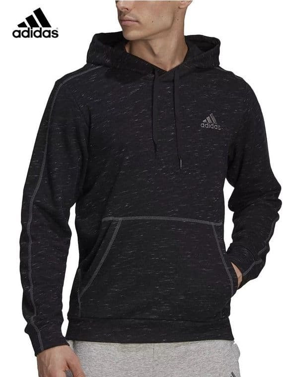 Description: Men’s Adidas ‘Essential Melange’ hooded sweatshirt. Features an Adidas logo on the front chest and a front pouch pocket.
