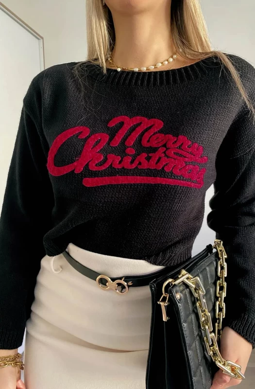 This glamorous and stylish knitted short jumper top is the perfect festive outfit! Featuring a 'Merry Christmas' printed detail on the front, it has a crew neckline and long sleeves for maximum comfort. Crafted from a soft and stretchy fabric. Available in different colours and comes in approx. sizes: S/M (UK 8/12) L/XL (UK 12/14). Approx. length of: 22"(56cm). Made of 85% Acrylic and 15% Polyamide and beautifully made in Italy.