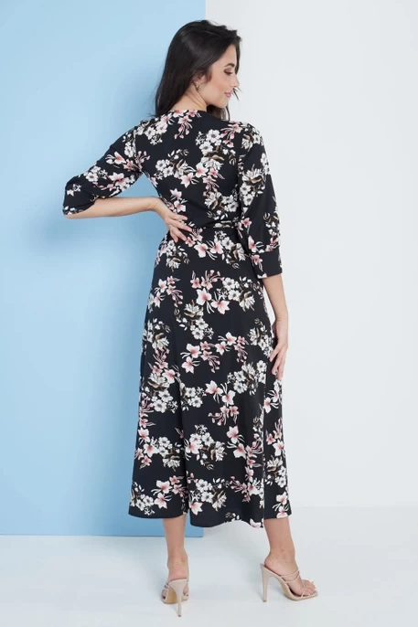 Your wardrobe refresh is here with our new black floral midi dress! Printed in a feminine floral pattern in black with white and pink. The wrap around shape is flattering for all body shapes. This dress is perfect for weddings, the races or any special occassion. Team this dress with some slip on open toe heels and a small bag to complement.