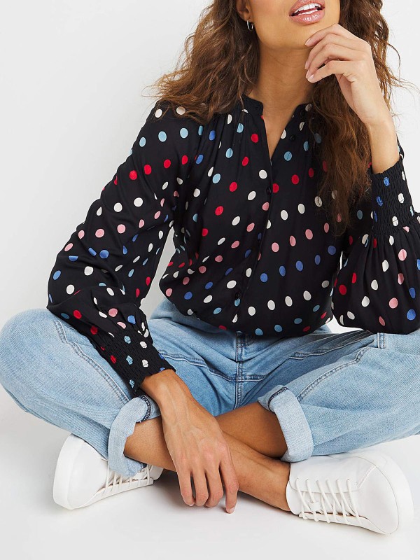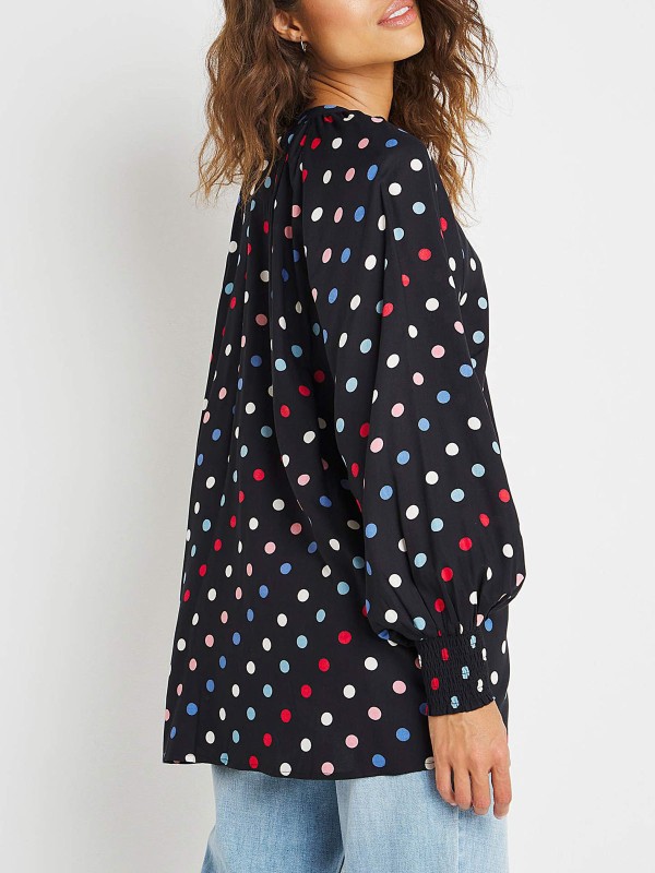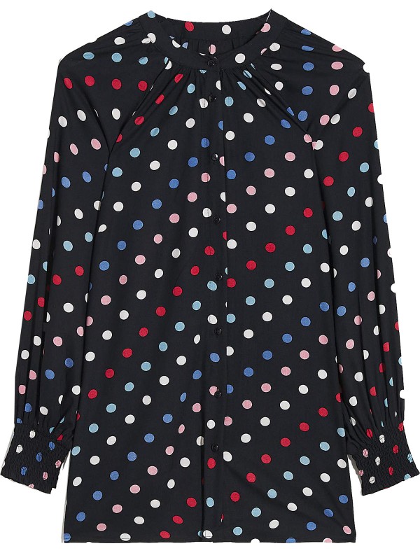 Update your wardrobe with this gorgeous multi spot blouse. In the best selling collarless shape with shirred cuff detailing in a beautiful, bold color. Perfect for any occasion. Length 31in.
