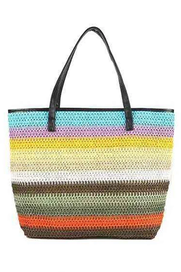 Brighten up your summer outings with this eye-catching Multicolor Woven Stripe Beach Tote Bag. Designed to combine fun, functionality, and style, this bag features vibrant horizontal stripes in a rainbow of colors that evoke the carefree spirit of sunny days. The textured woven design gives it a charming handcrafted look, while the black faux leather handles add a touch of sophistication and durability. Spacious enough to carry your beach essentials, shopping finds, or daily must-haves, this tote is perfect for casual outings, vacations, or day trips. Its lightweight construction and roomy interior make it a practical choice without sacrificing style. Whether you're headed to the seaside or strolling through the market, this colorful tote bag is the perfect companion for your seasonal adventures.Brighten up your summer outings with this eye-catching Multicolor Woven Stripe Beach Tote Bag. Designed to combine fun, functionality, and style, this bag features vibrant horizontal stripes in a rainbow of colors that evoke the carefree spirit of sunny days. The textured woven design gives it a charming handcrafted look, while the black faux leather handles add a touch of sophistication and durability. Spacious enough to carry your beach essentials, shopping finds, or daily must-haves, this tote is perfect for casual outings, vacations, or day trips. Its lightweight construction and roomy interior make it a practical choice without sacrificing style. Whether you're headed to the seas