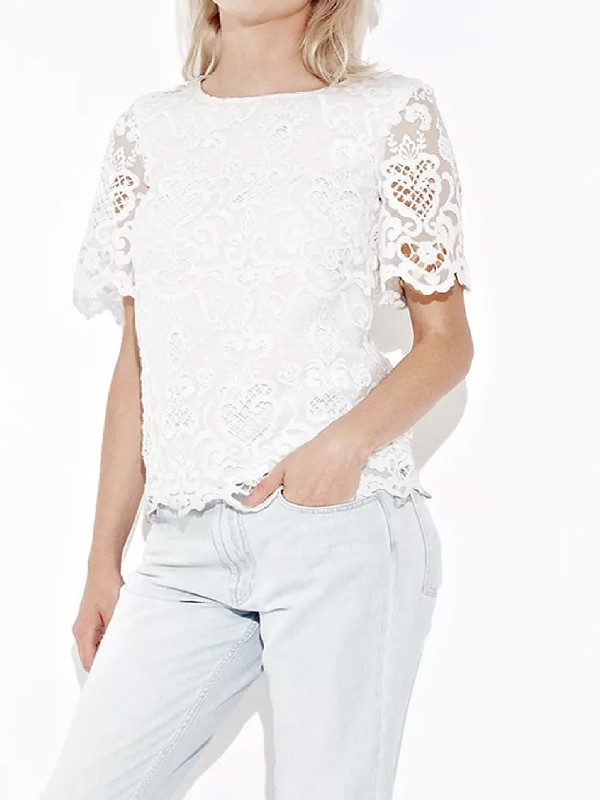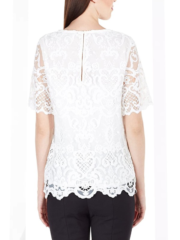 Look effortlessly chic in this Nebraska Lace Tunic Top. This modern top is crafted from an elegant Broderie Anglaise lace fabric. Featuring a round neckline with back keyhole with hook-and-eye closure. Half sleeves and a scallop hem and cuffs. Partially lined. Length 25in/61cm.