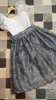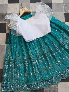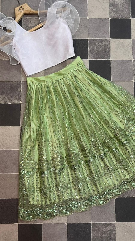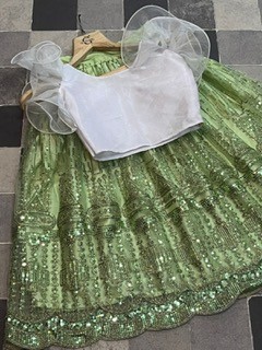 Stun everyone by matching attires, this kids lehenga embroidered set for wedding occasions. This readymade set includes flared net lehenga choli with a matching organza blouse designer sleeves and similarly embellished