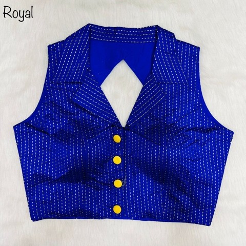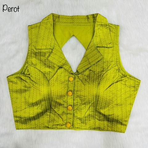 *FABRIC*:-- *Jari line Jecquard* *SIZE*:- Free Size 38 Inch upto 40 Inch. *DESGINE*:- Stylish shirt collar blouse with short sleeves in side attached .. Front open hooks.