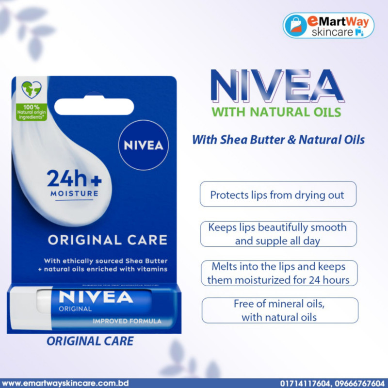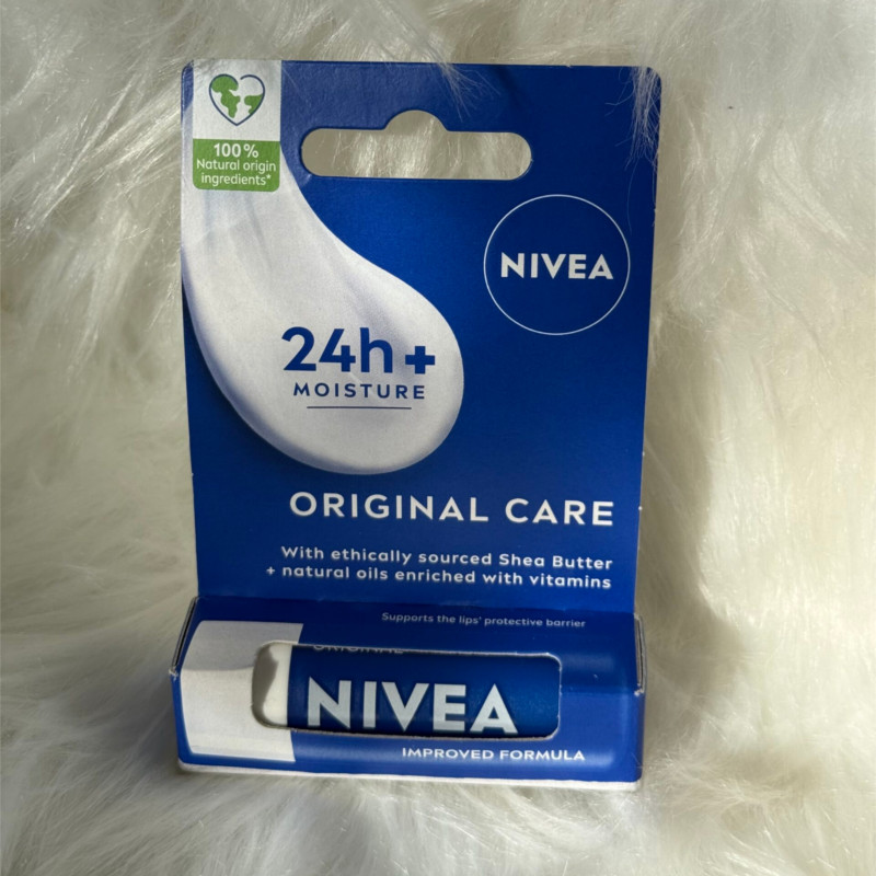 Nivea 24Hr + Moisture Original Care Lip Balm With Natural Ingredients 4.8 g delivers enduring hydration and gentle, daily lip care with a formula enriched with natural moisturising ingredients that help lock in moisture and keep lips feeling soft, smooth, and comfortable for up to 24 hours. Its rich, creamy texture glides on effortlessly and absorbs quickly without heaviness or stickiness, creating a protective barrier against dryness and chapping. Infused with nourishing plant‑based oils and butters, it helps restore natural lip softness while shielding against environmental stressors like wind, cold, and everyday exposure. Designed for everyday use, it provides long‑lasting comfort and maintains optimal hydration, reducing the need for frequent reapplication. The classic, neutral scent adds a pleasant, subtle touch without overpowering. Compact and portable, the 4.8 g size fits perfectly into purses, pockets, or backpacks for convenient on‑the‑go care. Suitable for all skin types, including sensitive lips, it delivers gentle yet effective moisturisation without irritation. Helps prevent flaking, cracking, and dryness while reinforcing overall lip health. Great for use under lipstick to enhance smoothness and prolong wear. Dermatologically tested for skin friendliness and reliable performance. Leaves lips feeling revitalised, nourished, and beautifully conditioned throughout the day. A versatile lip care essential that combines natural ingredients with deep, long‑lasting moisturisation. Nivea 24Hr + Moisture Original Care Lip Balm keeps lips hydrated, protected, and comforted with every use.