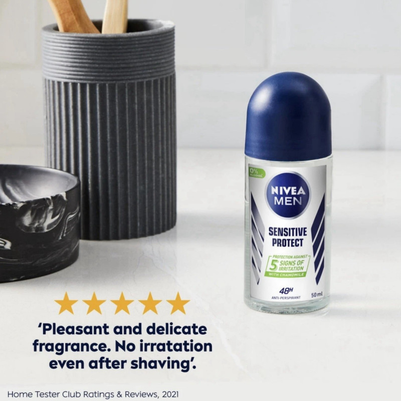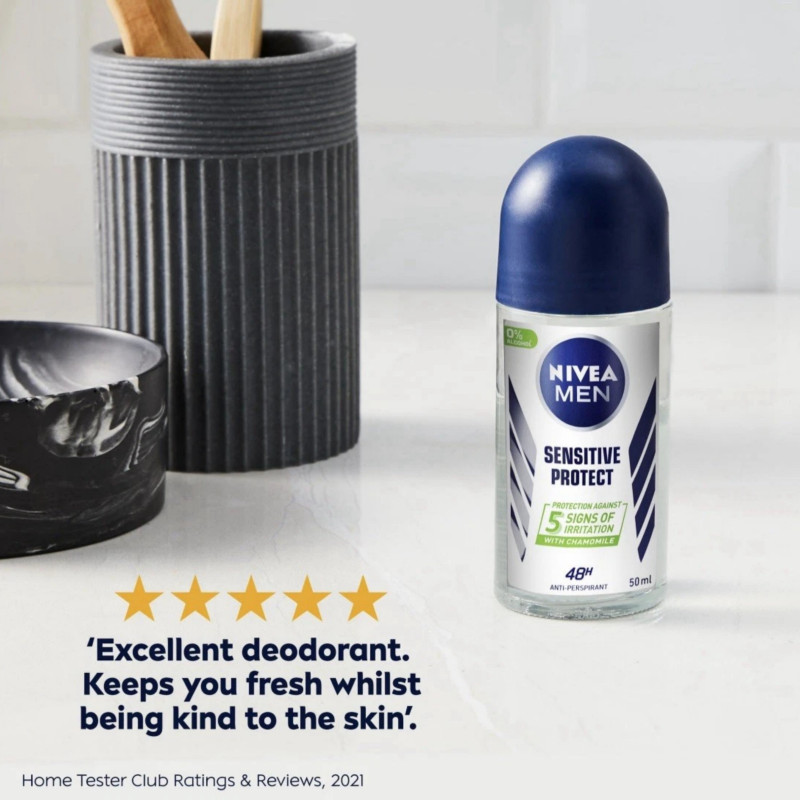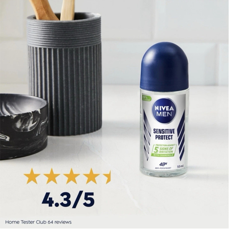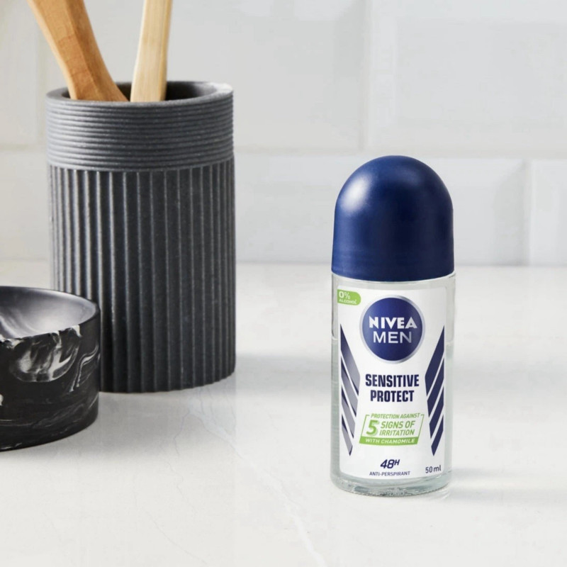 Nivea Men Sensitive Protect 48Hr Protection Anti-Perspirant Deodorant Roll-On 50ml provides up to 48 hours of effective protection against sweat and odor, keeping underarms dry, fresh, and comfortable all day. Its gentle formula is specially designed for sensitive skin, enriched with soothing ingredients to help prevent irritation and maintain healthy underarm skin. Quick-drying and non-sticky, it absorbs instantly for a comfortable, mess-free application. Helps prevent wetness, odor, and white marks on clothing, keeping clothes clean and fresh. Infused with a subtle, fresh fragrance, it leaves underarms lightly scented and confidently fresh. Lightweight and easy to apply with the convenient roll-on design for precise coverage. Suitable for daily use at work, workouts, or outdoor activities. Can be layered without discomfort for extended freshness. Compact and travel-friendly, perfect for on-the-go use. Supports daily underarm care while delivering reliable anti-perspirant protection. Maintains underarm smoothness, dryness, and comfort throughout the day. Dermatologically tested for safety and gentle care on all skin types. Provides a refreshing, calming feeling for all-day confidence. Nivea Men Sensitive Protect Roll-On combines gentle care, long-lasting freshness, and dependable protection for sensitive underarms.