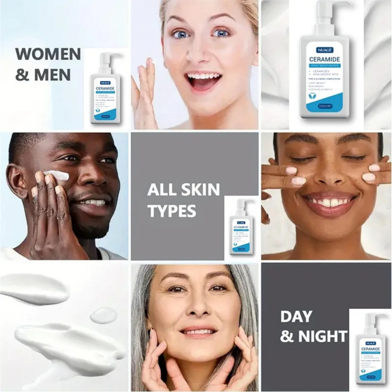 The Nuage Light Weight & Non-Greasy Ceramide Daily Moisturiser 250ml is a versatile, fast-absorbing, and nourishing formula designed to hydrate and protect both the face and body. This daily moisturizer is enriched with a powerful blend of essential skincare ingredients, including three potent ceramides (Ceramide NP, Ceramide AP, and Ceramide EOP), hyaluronic acid, and vitamin E, that work synergistically to support and renew the skin's natural protective barrier. Its key benefits include deep, long-lasting hydration by attracting and retaining moisture within the skin layers, which helps alleviate dryness and discomfort. The lightweight, non-greasy texture ensures quick absorption without leaving any heavy or sticky residue, making it suitable for all skin types, including sensitive and acne-prone skin, and it can be used comfortably under makeup. The formula also provides antioxidant benefits from the inclusion of Vitamin E and helps improve skin elasticity to diminish the appearance of fine lines and wrinkles, promoting a healthy-looking, supple, and radiant complexion. Additionally, it is a vegan-friendly and fragrance-free product, appealing to those with specific preferences or sensitivities. The cream is packaged in a convenient 250ml pump dispenser bottle for easy and hygienic daily application.